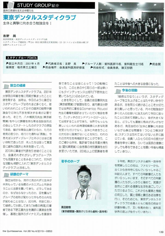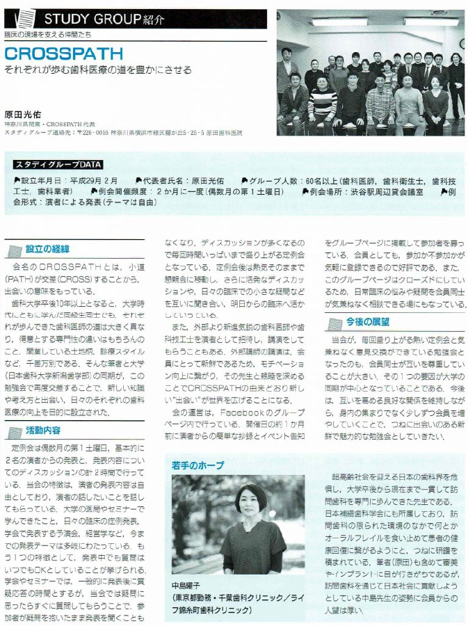 スタディグループ紹介にて、毎月開催の勉強会である、東京デンタルスタディクラブでの若手のホープとして取り上げられた。