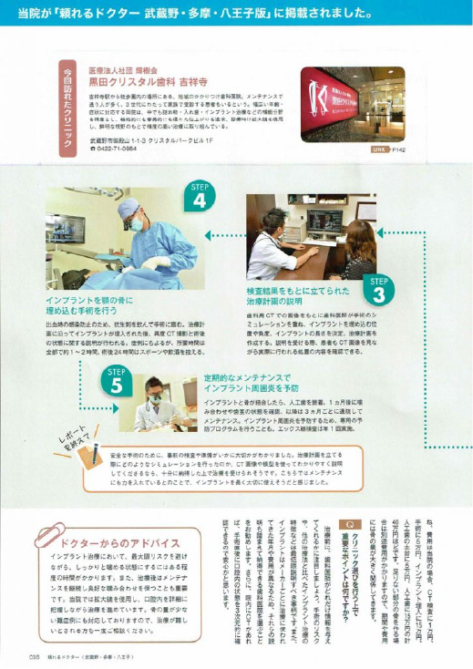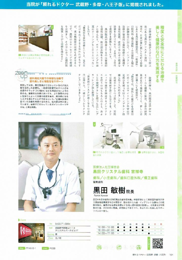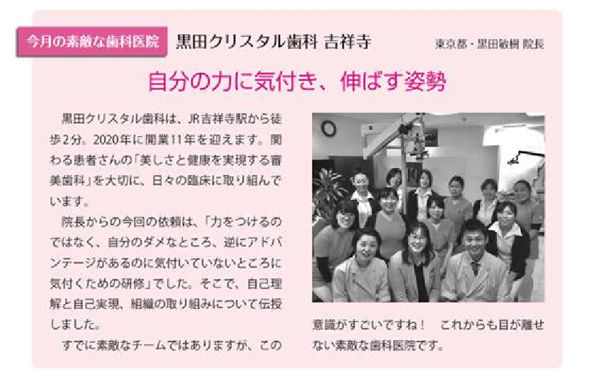 歯科界での業界紙において、黒田クリスタル歯科 吉祥寺 が、【今月の素敵な歯科医院】で紹介されました。