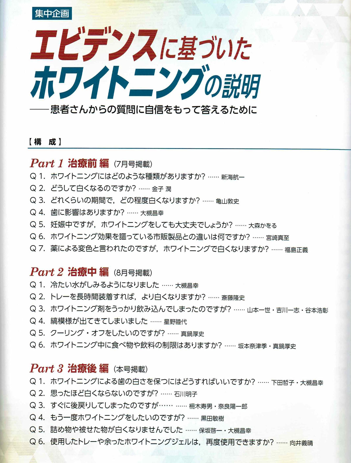 歯科の月間機関紙 歯科評論の特集で3巻にわたる ホワイトニング特集(7月号8月号10月号にわたり、治療前、治療中、治療後)のエビデンスに基づいた説明の歯科医師・歯科衛生士向けのホワイトニングQ&A