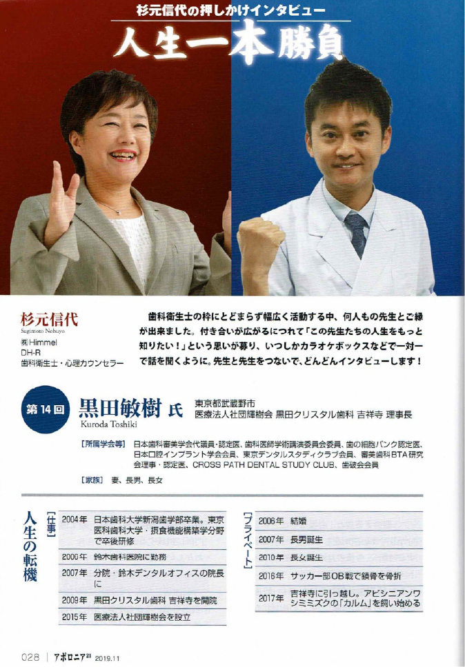 人生一本勝負 という題材で、歯科医師として、なるべくしてなった理由、黒田クリスタル歯科 吉祥寺を10年前に、吉祥寺という地で開業した理由、吉祥寺で開院10周年を迎えられたという事実への背景。 黒田クリスタル歯科 吉祥寺の今後の展望についての取材を受けました。 -