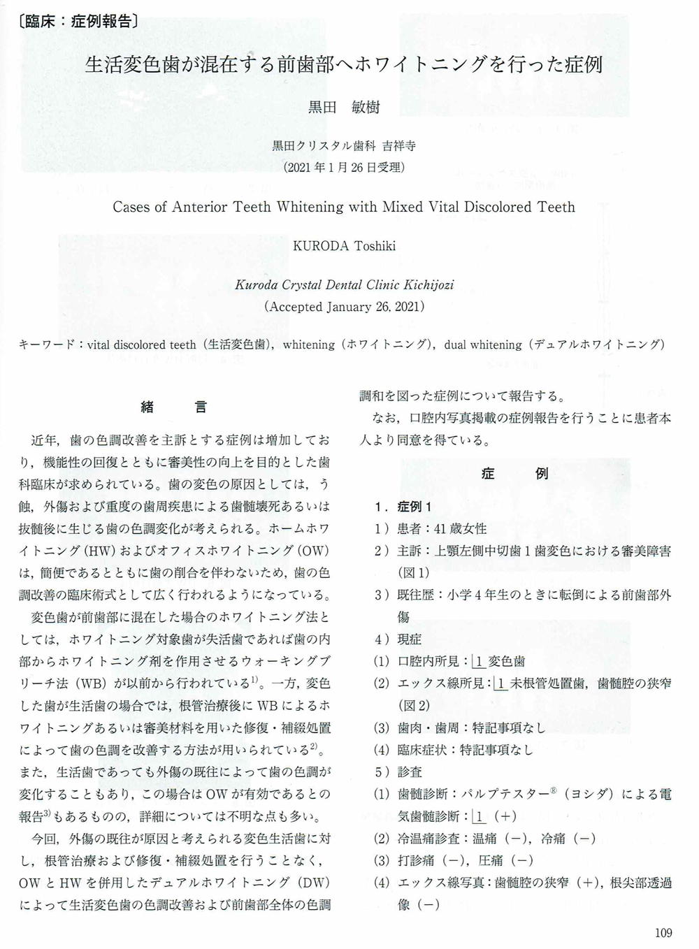 歯科の月間機関紙 クイント 11月号に 黒田敏樹の【生活歯1歯変色に対してホワイトニングを行った症例】が掲載されました。