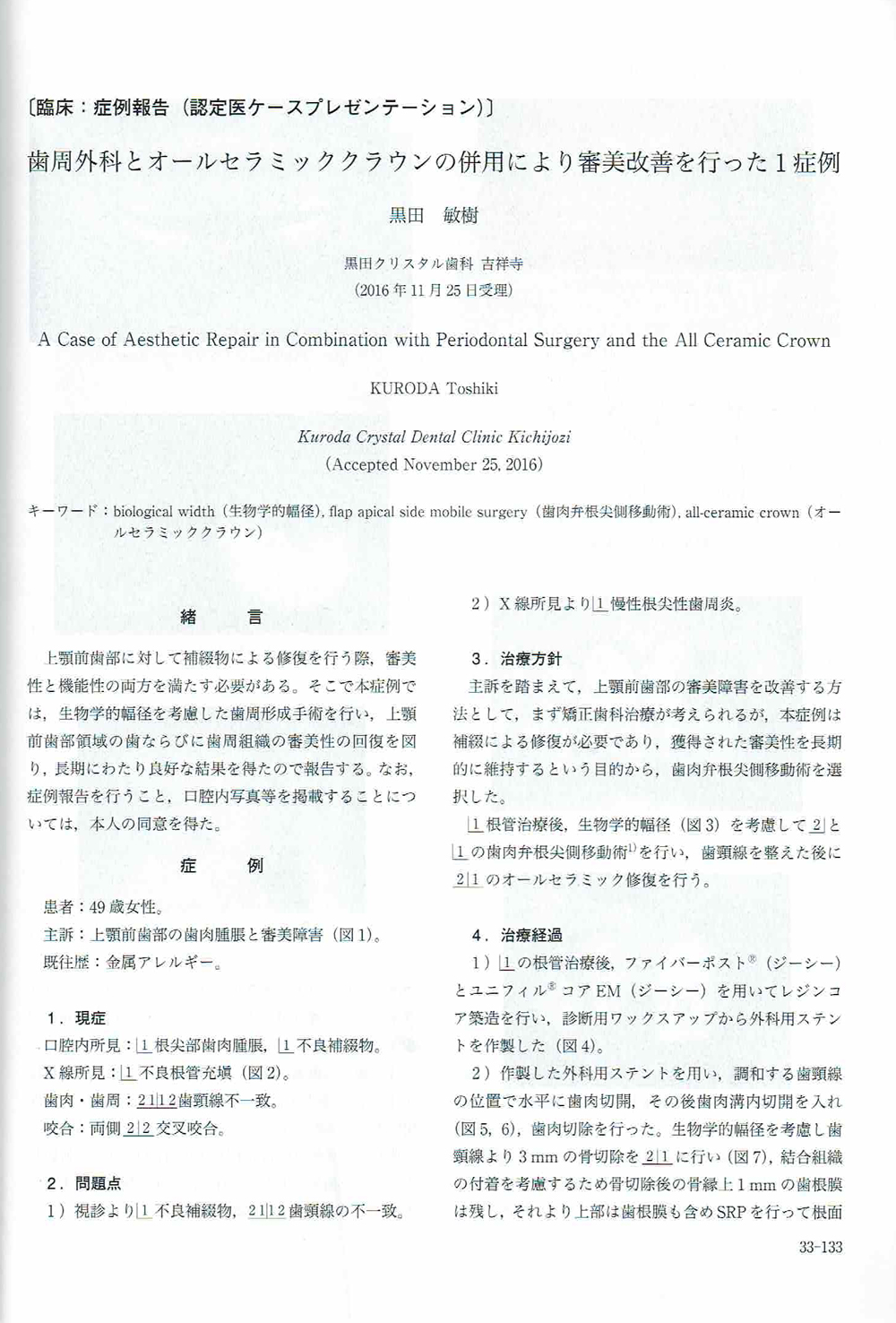 2017.3月発刊 学会誌 歯科審美 掲載表題 「 歯周外科とオールセラミッククラウンの併用により審美改善を行った1症例 」