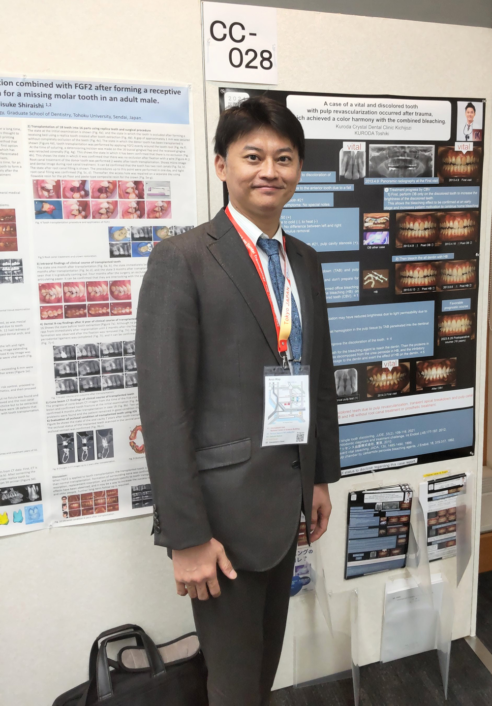 今回、このような症例で、歯の神経を抜くことなく、歯を削りもしないデュアルホワイトニング フォー バイタル ティース と名付けたホワイトニング方法で歯の色調を整え、さらに、お口全体の色調も白く出来た症例について大判のポスターを用いて学会発表致しました。プラントにセラミックを製作し、良い結果を得た内容を学会発表致しました。 -