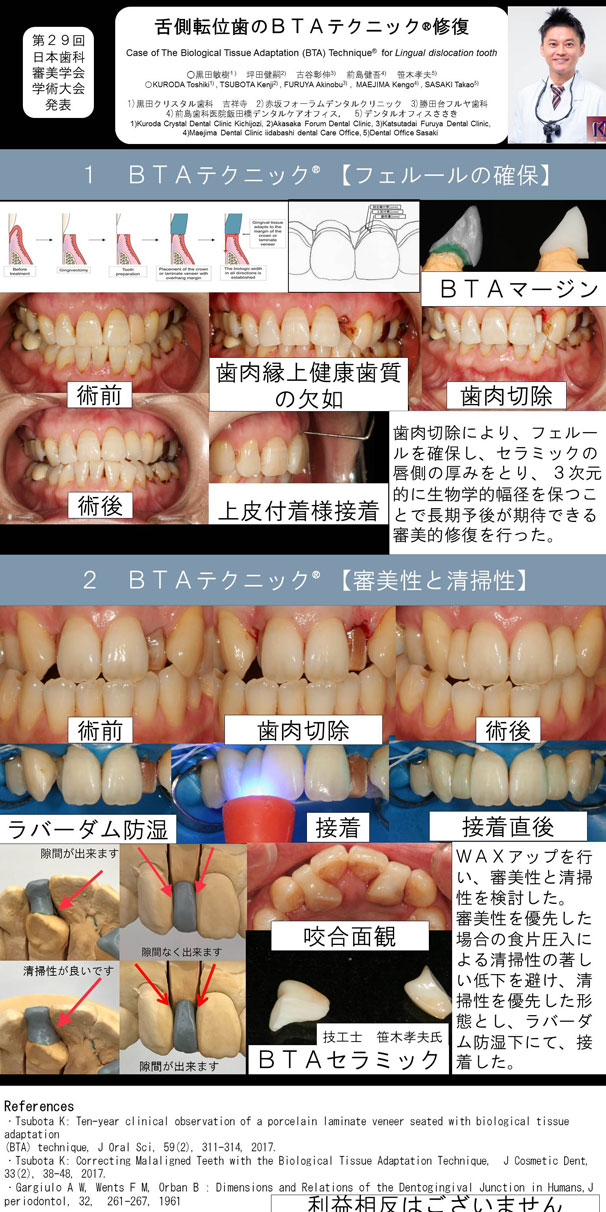 もう一つは、従来であれば矯正治療で2年前後の治療が必要な治療、もしくは抜歯してインプラントやブリッジといった期間的にも、費用的にも多くなってしまう症例に対して BTA TechniqueR を持ちいて、審美的に、また歯ブラシもしやすい形にセラミック修復した症例についてを大判のポスターを用いて学会発表致しました。 -