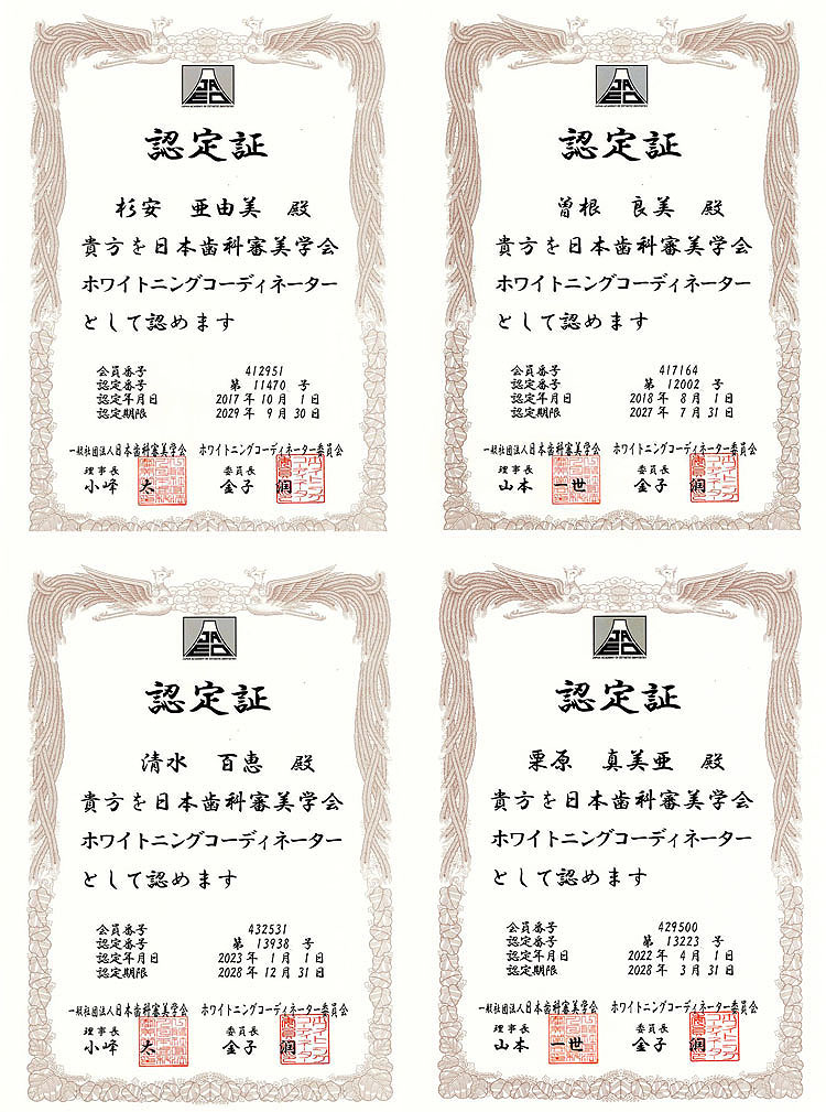 黒田クリスタル歯科 吉祥寺では、ホワイトニングコーディネーターの認定書を持った歯科衛生士がホワイトニングを担当しております。