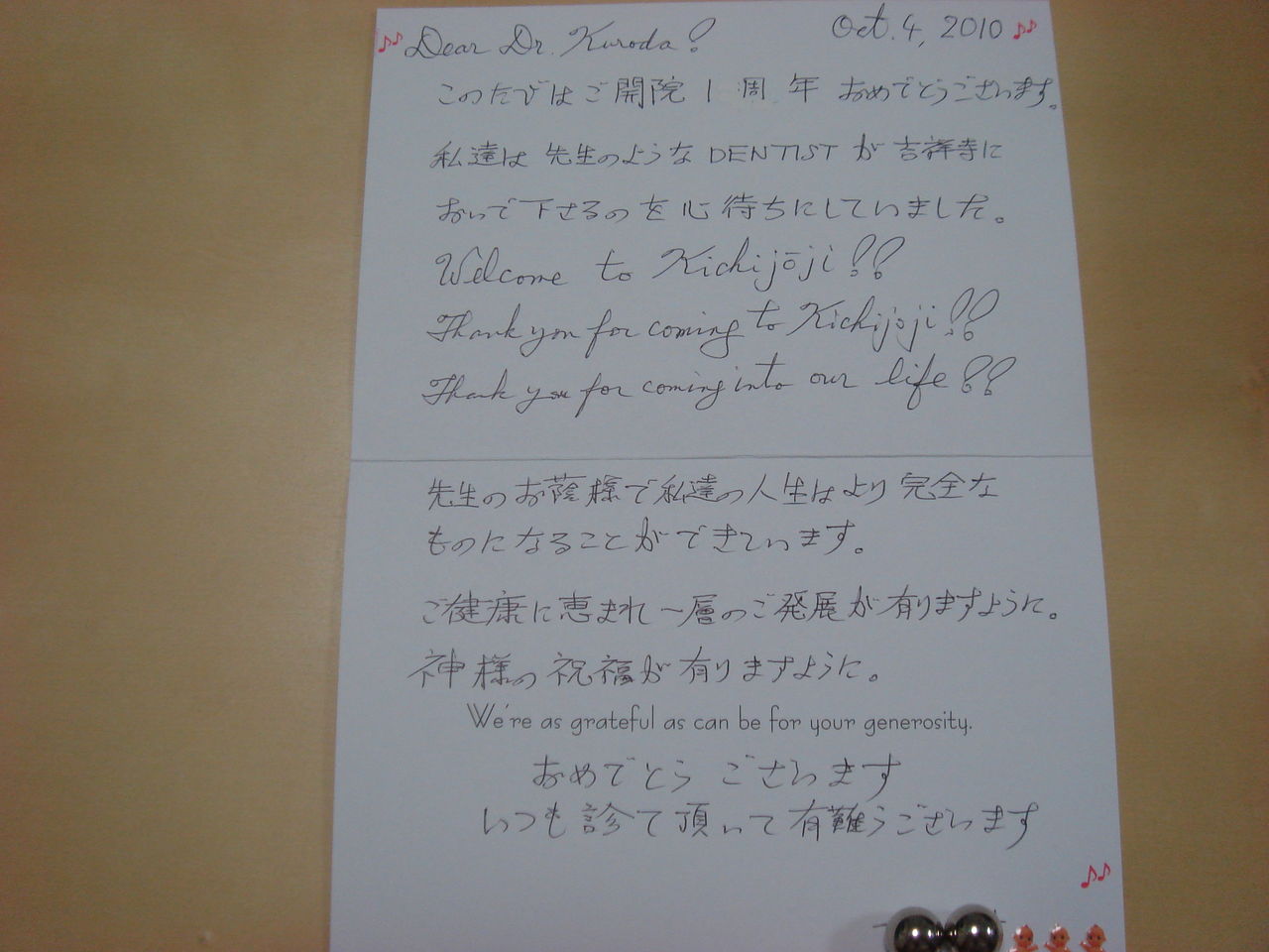 そしてこれからも、患者様の為に良い治療、美しく、健康なお口の為にと心引き締まります。 患者様からメッセージでありがとうと頂きましたが(写真)、ありがとうございますはこちらの方です。 黒田クリスタル歯科 吉祥寺が一周年を迎えられたのは皆様のおかげであり、手前味噌でありますがスタッフのおかげもあります。 改めて皆様ありがとうございます。 これからも私、黒田クリスタル歯科 吉祥寺 院長黒田敏樹は、より良い診療を行っていきたいと思います。