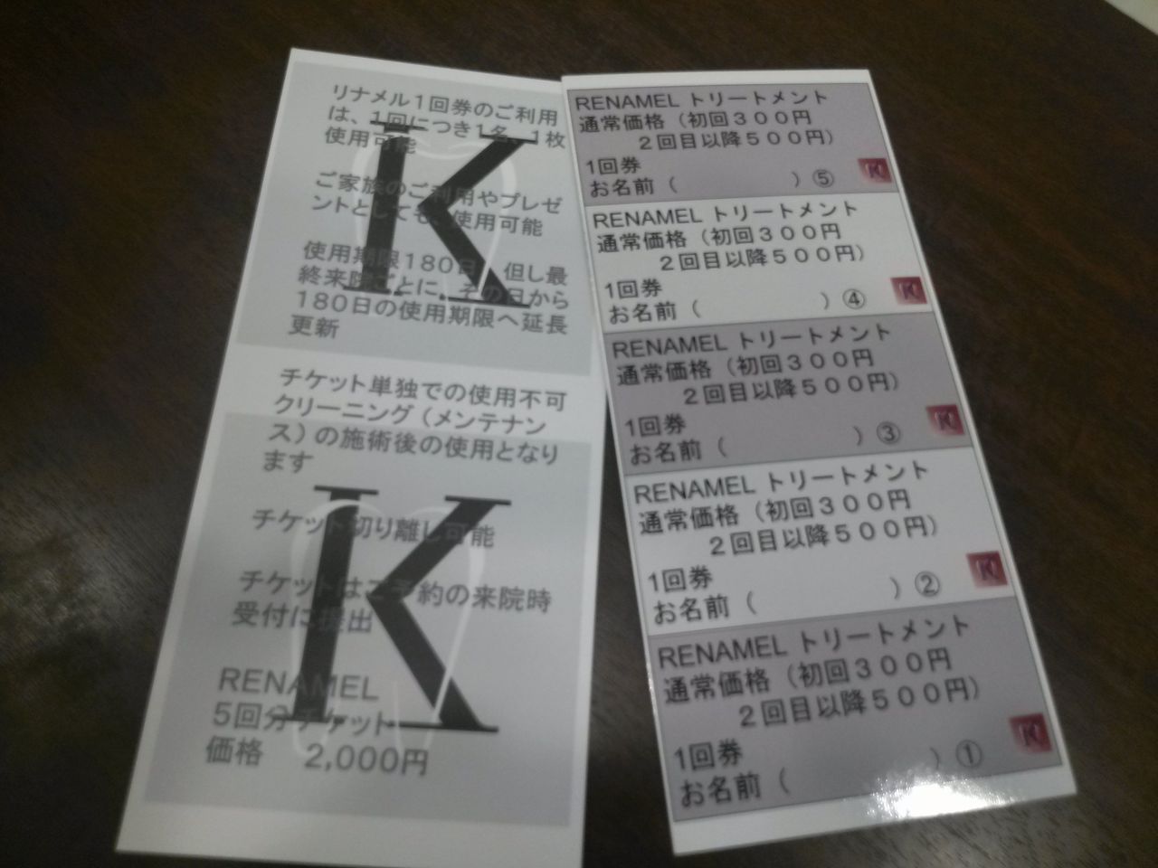 通常500円のリナメルトリートメントを、5回分の回数券で2千円です。一回分お得です。