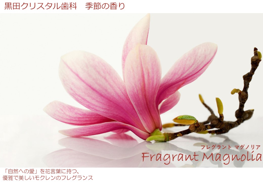 黒田クリスタル歯科 吉祥寺 10月 アロマ フレグランス Fragrant Magnolia フレグラント マグノリア 黒田クリスタル歯科 吉祥寺では、毎月院内のアロマの香りを変えております。 黒クリメンバー皆で選んだアロマ 2021年10月は ♪ Fragrant Magnolia ♬ フレグラント マグノリア ♪ アンジュペアやレッドアップル 高級感のあるフルーティフローラル 優雅で美しいモクレンのフレグランス お楽しみください☆ コロナ禍により、入り口ドアは常時開放中 ドアの開放により、アロマの香りが薄れてますが、それでも香るアロマ・フレグランスをお楽しみ頂ければ幸いです♪