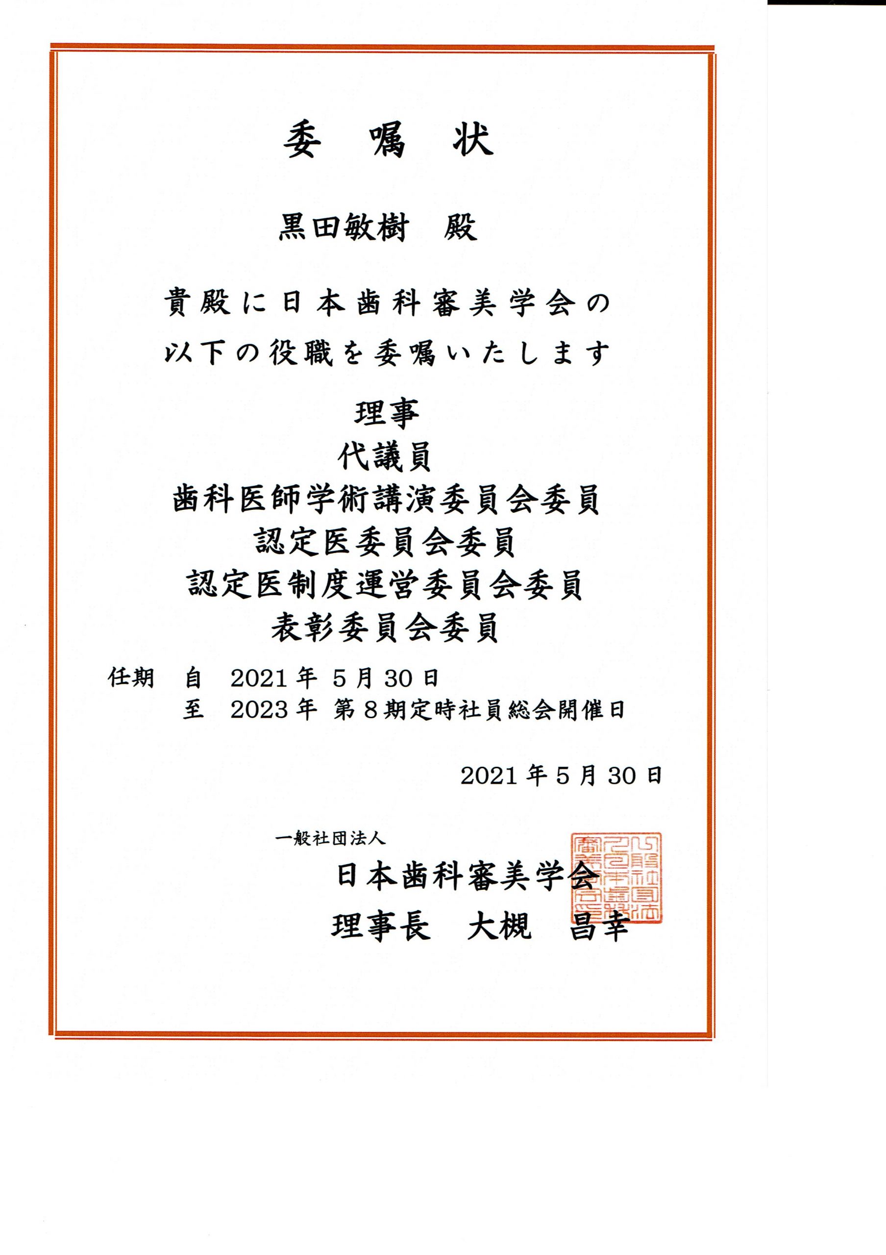 日本歯科審美学会 理事 認定医制度委員会 一次院長不在 黒田クリスタル歯科吉祥寺