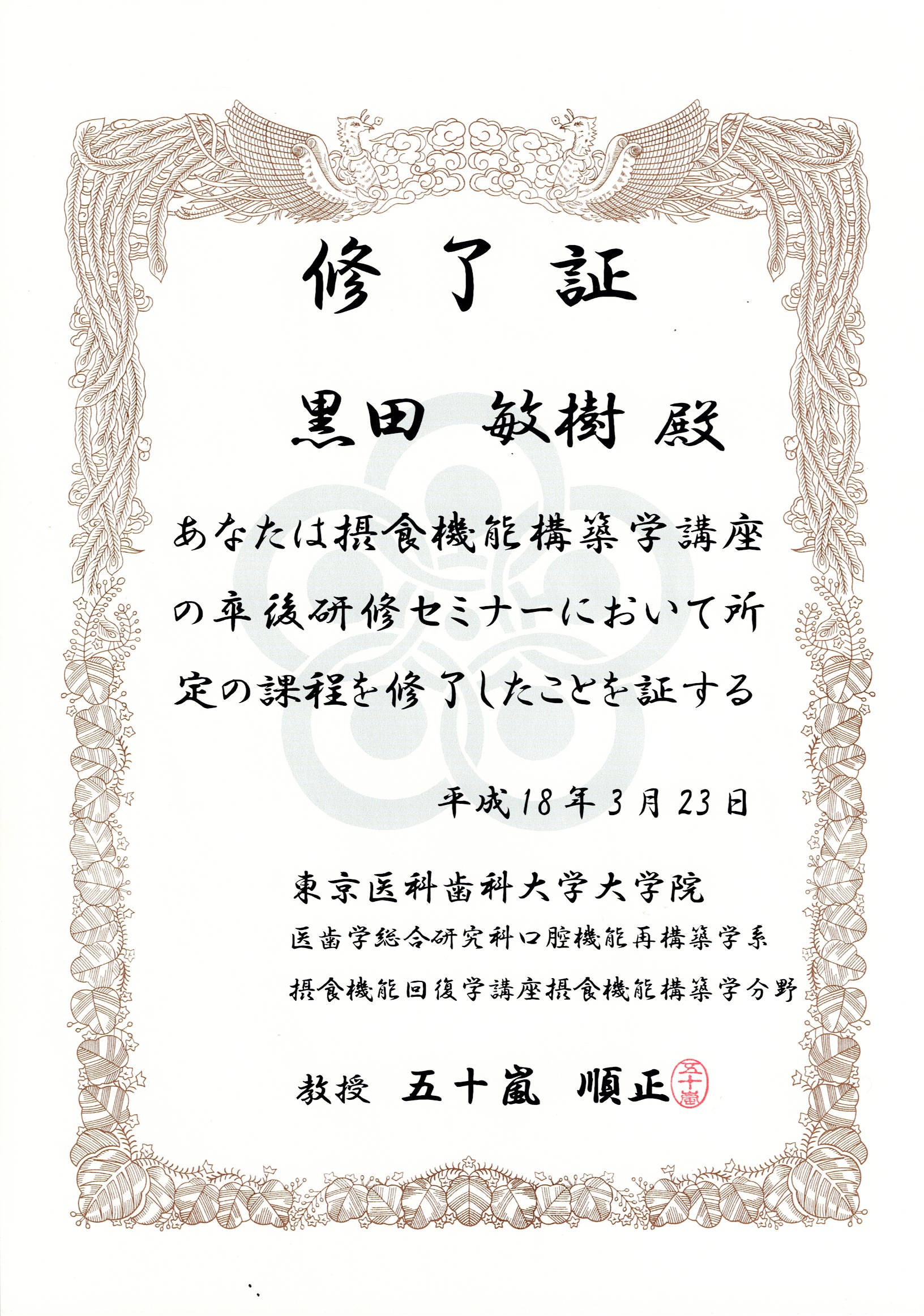 - 東京医科歯科大学 摂食機能構築学口座卒後研修セミナー修了 2006.3月